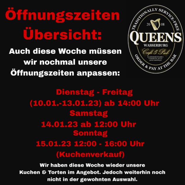 Liebe Gäste, auch diese Woche müssen wir nochmal unsere Öffnungszeiten anpassen: Dienstag – Freitag (10.01.-13.01.23) ab 14:00 Uhr Samstag, 14.01.23 ab 12:00 Uhr Sonntag, 15.01.23 12:00 – 16:00 Uhr (Kuchenverkauf) In dieser Woche haben wir wieder unsere Kuchen & Torten im Angebot. Jedoch weiterhin noch nicht in der gewohnten Auswahl. Vielen Dank für euer…